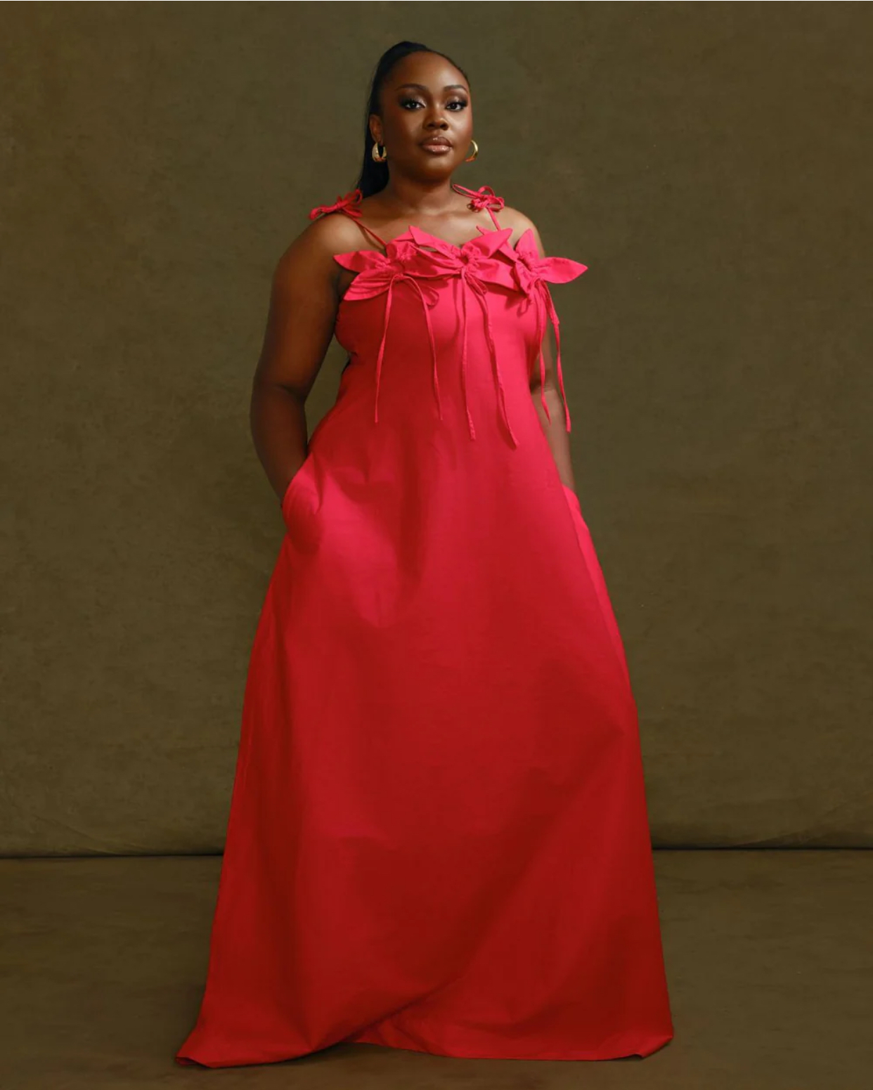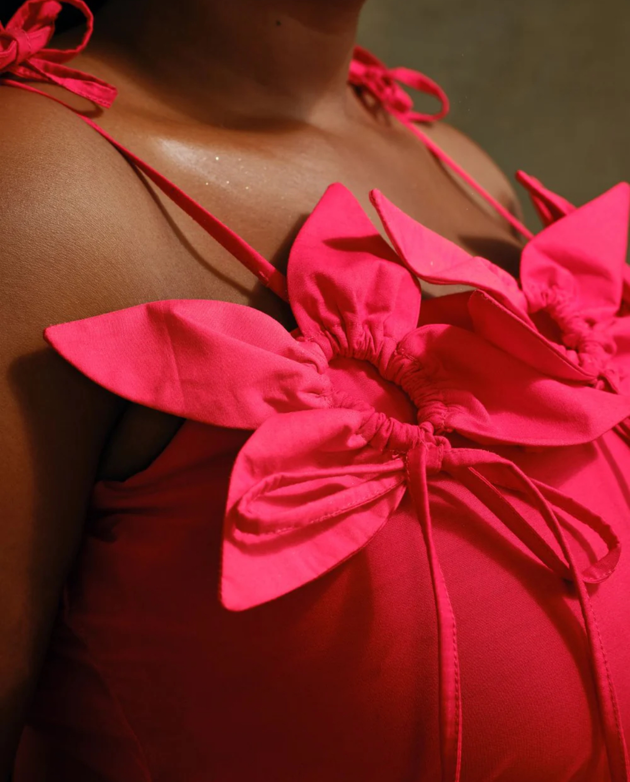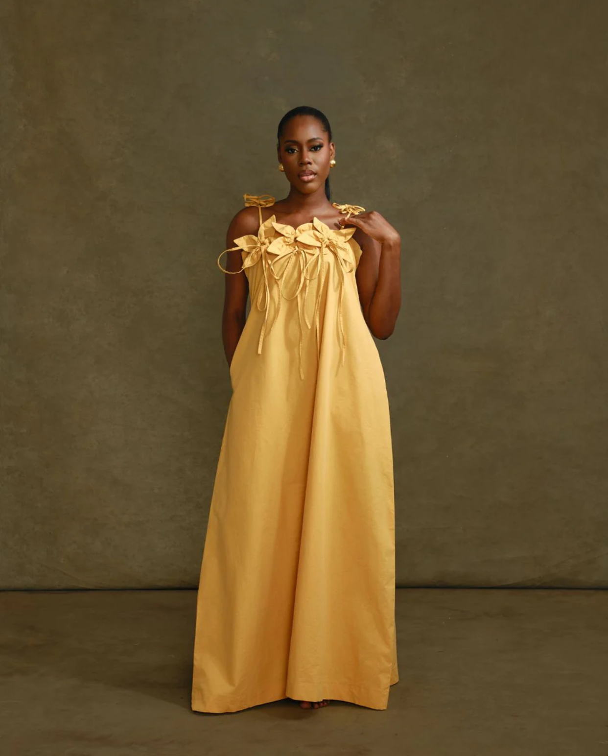 Crafted from soft and breathable cotton material. The A-line silhouette drapes beautifully, making it a flattering choice for any figure. with statement flower details along the neckline and
