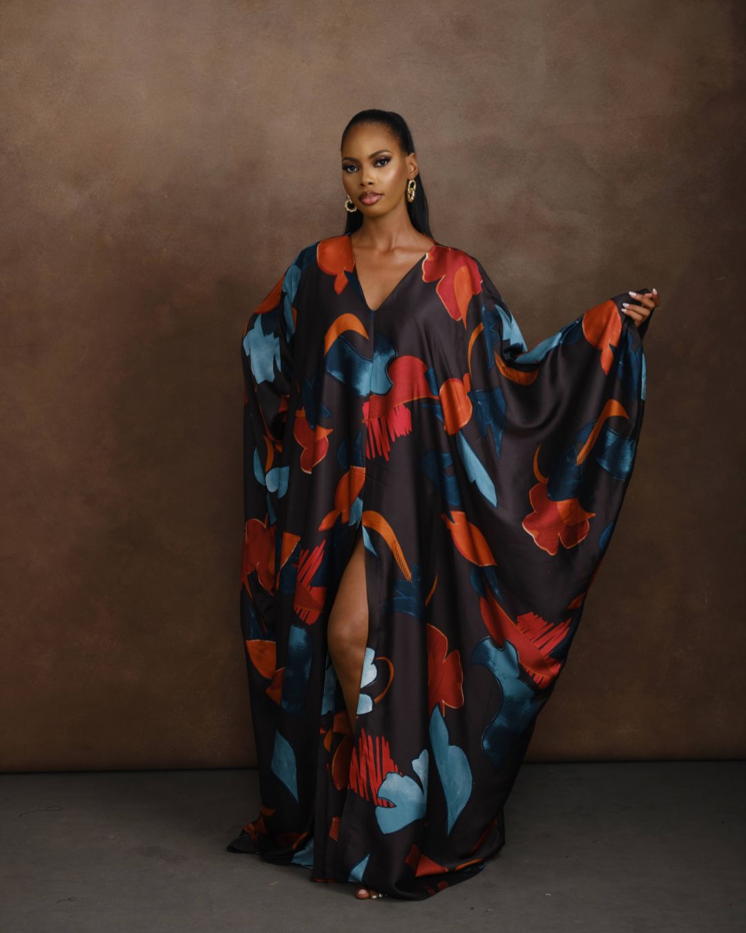 Crafted from premium satin silk, it features a bold, abstract floral print in rich jewel tones of teal, burnt orange, and crimson against a deep charcoal backdrop — an artful balance of drama and grace. The voluminous cut glides with your every movement, while the deep V‑neckline and front slit add a touch of contemporary sensuality. Perfect for evening occasions, destination getaways, or intimate celebrations, this kaftan is a timeless piece that effortlessly transitions from luxe lounging to red‑carpet‑worthy elegance.