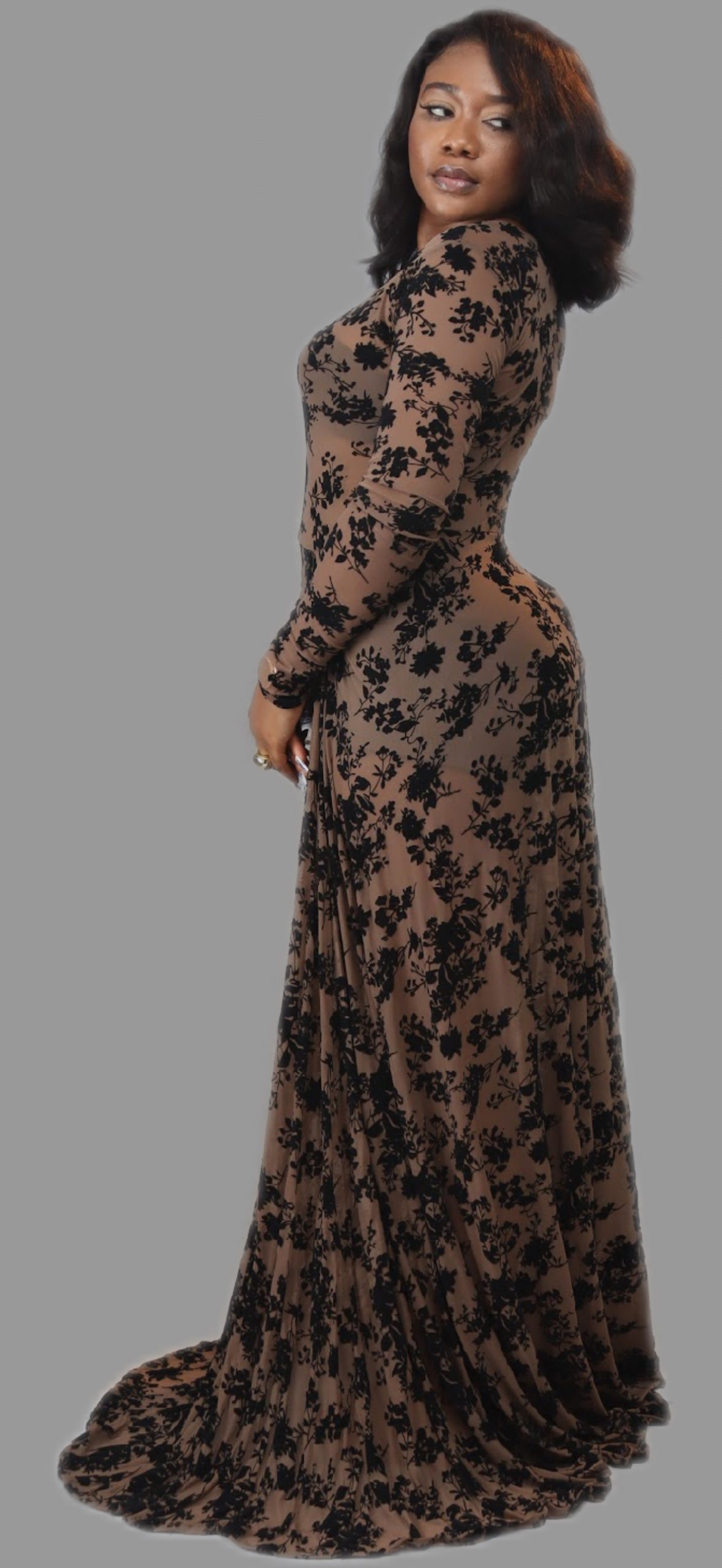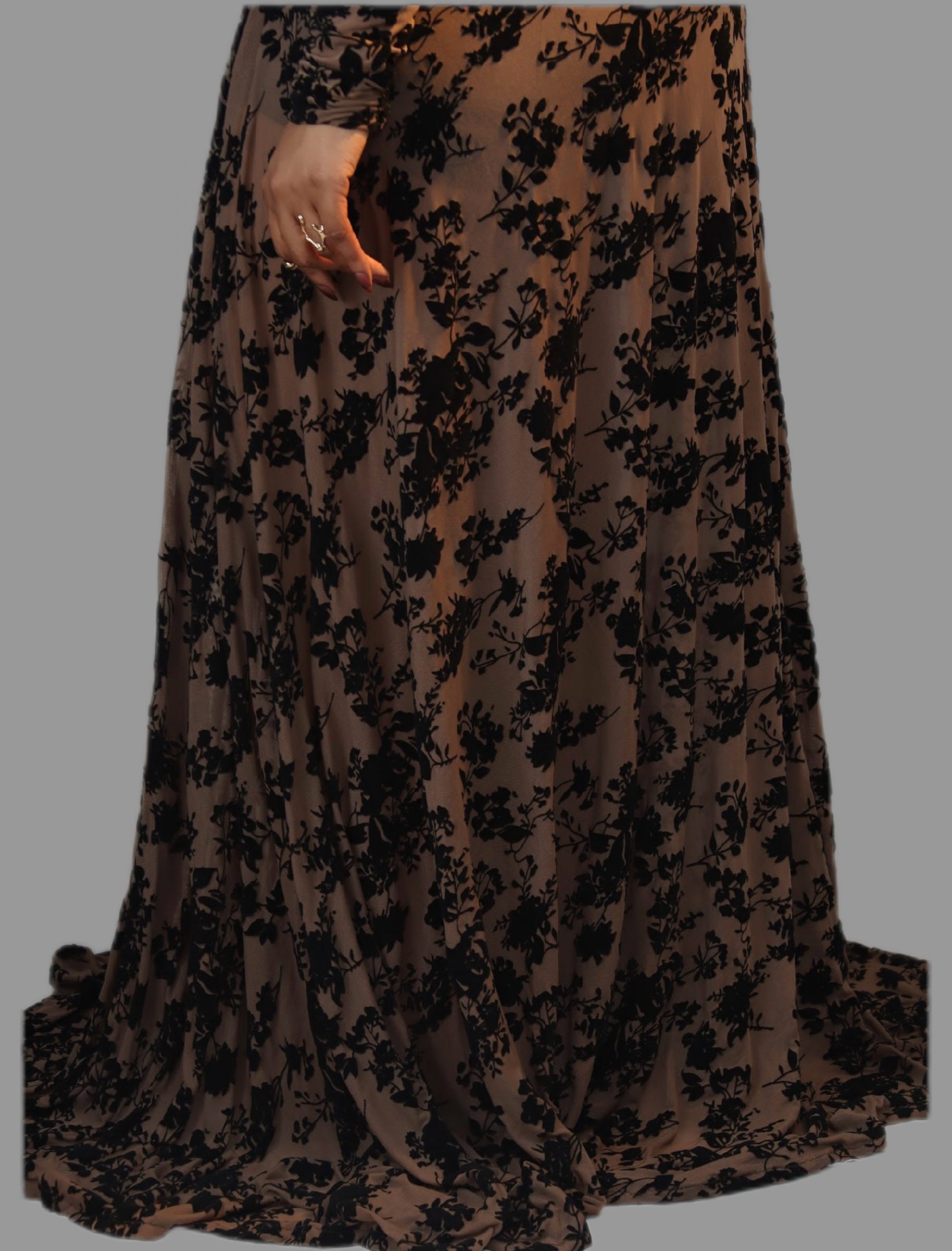 DAYA is our floral Velvet detail Mesh Fabric Floor Lenght dress. Fitted to the waist and flows with grace.