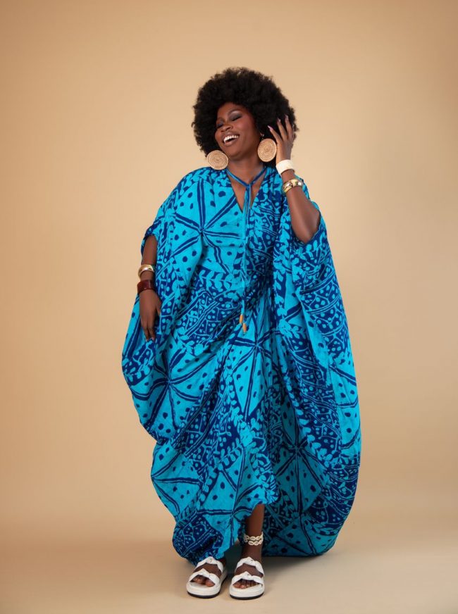 Made from high-quality Adire Marocain fabric, this kaftan is inspired by traditional Ethiopian womenswear. It features elegant front drapes, a flattering V-neckline, and an inner belt to cinch the waist. Finished with two drop-down neck ropes detailed with African bead stoppers, it blends cultural influence with modern sophistication. Perfect for relaxed luxury, cultural events, or statement daywear.
