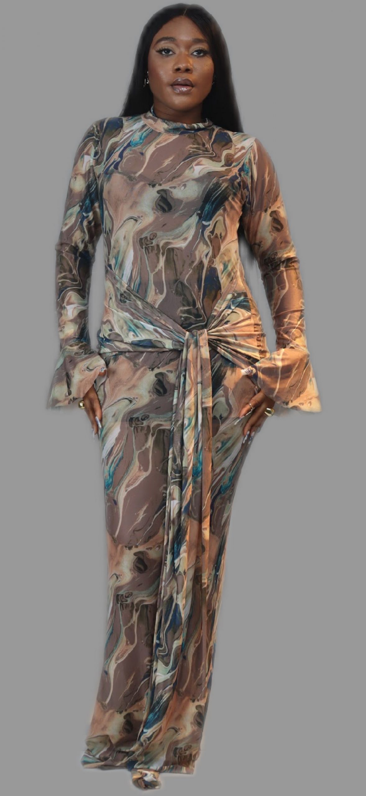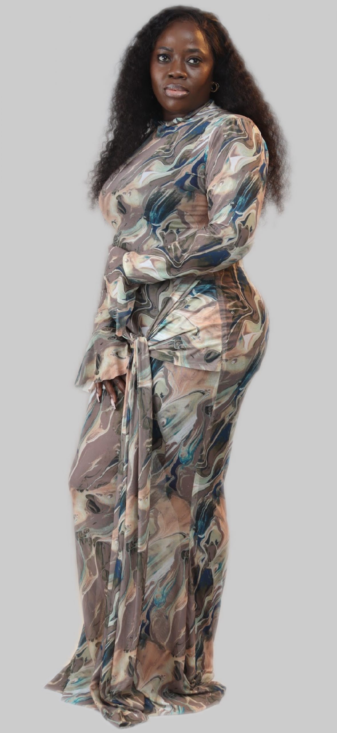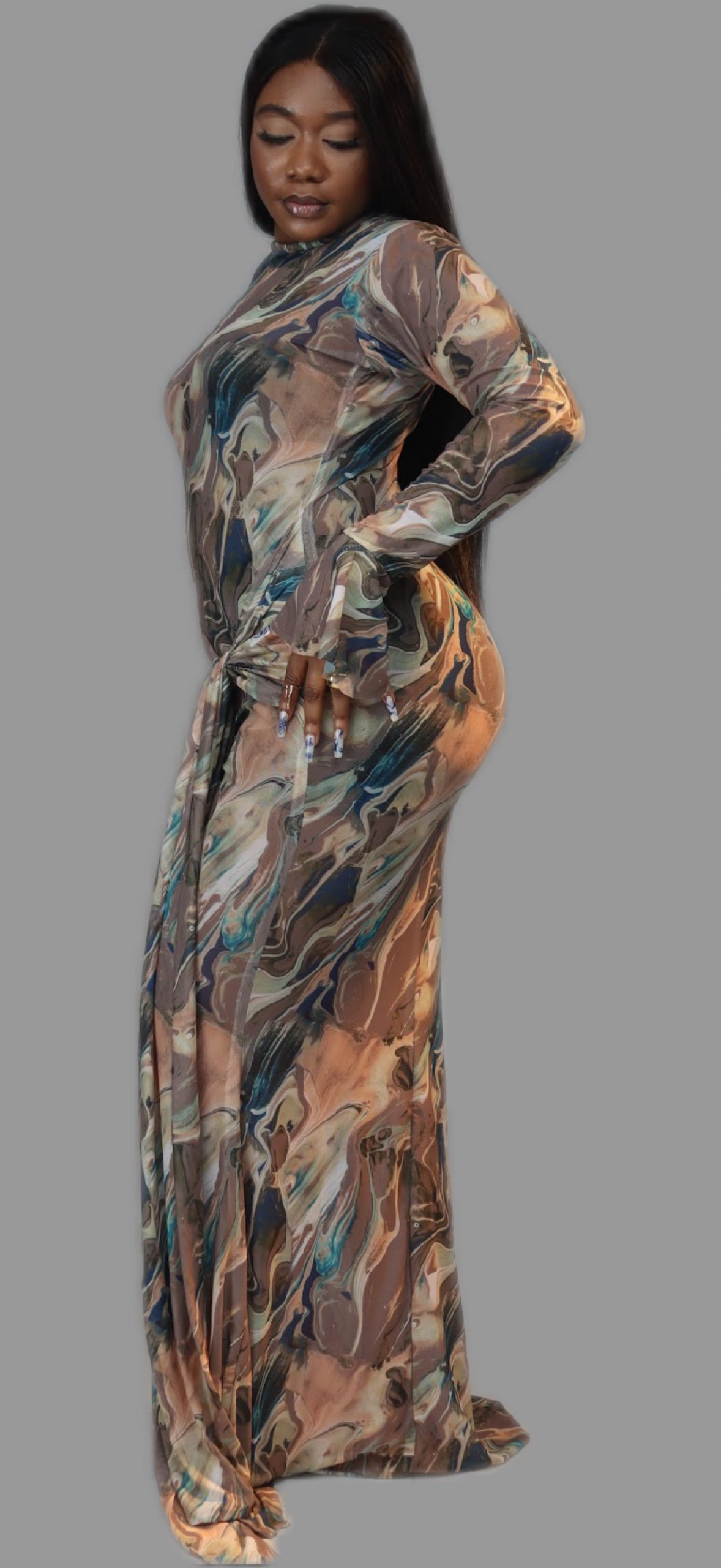 A canvas of confidence, crafted in luxe stretch mesh with a marbled swirl of earth, jade and stone tones. This floor length stunner hugs your curves in all the right places skimming gracefully with every step.