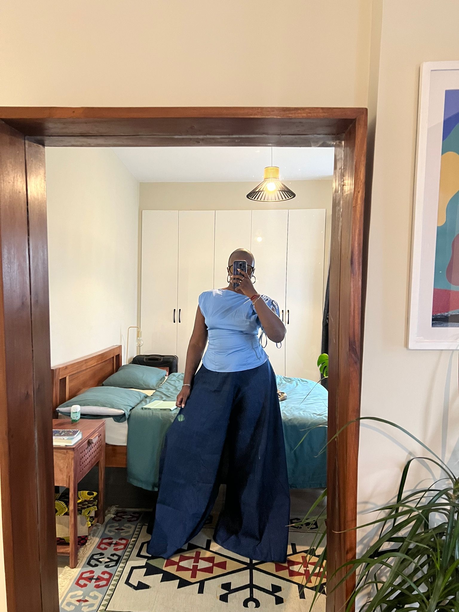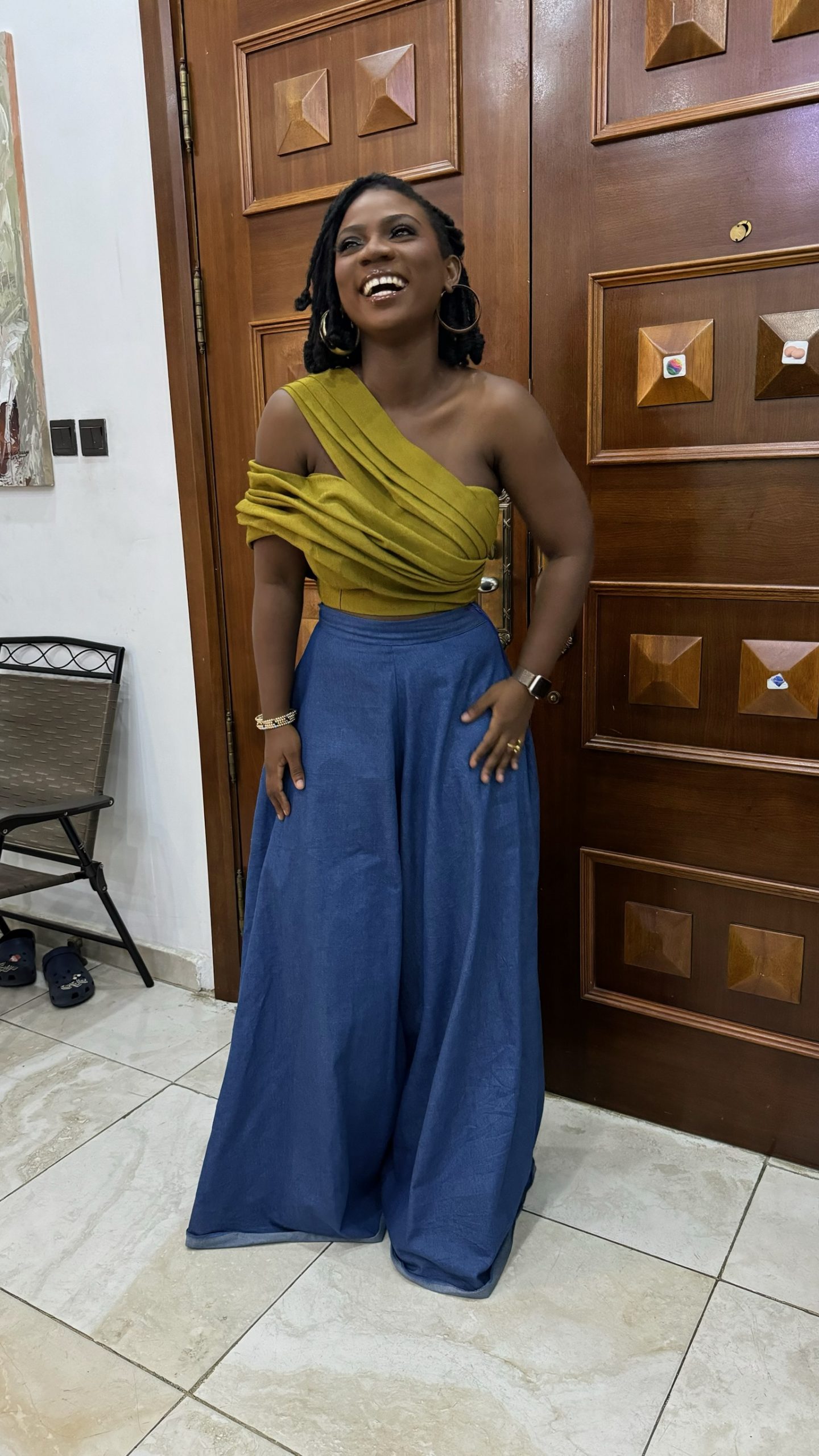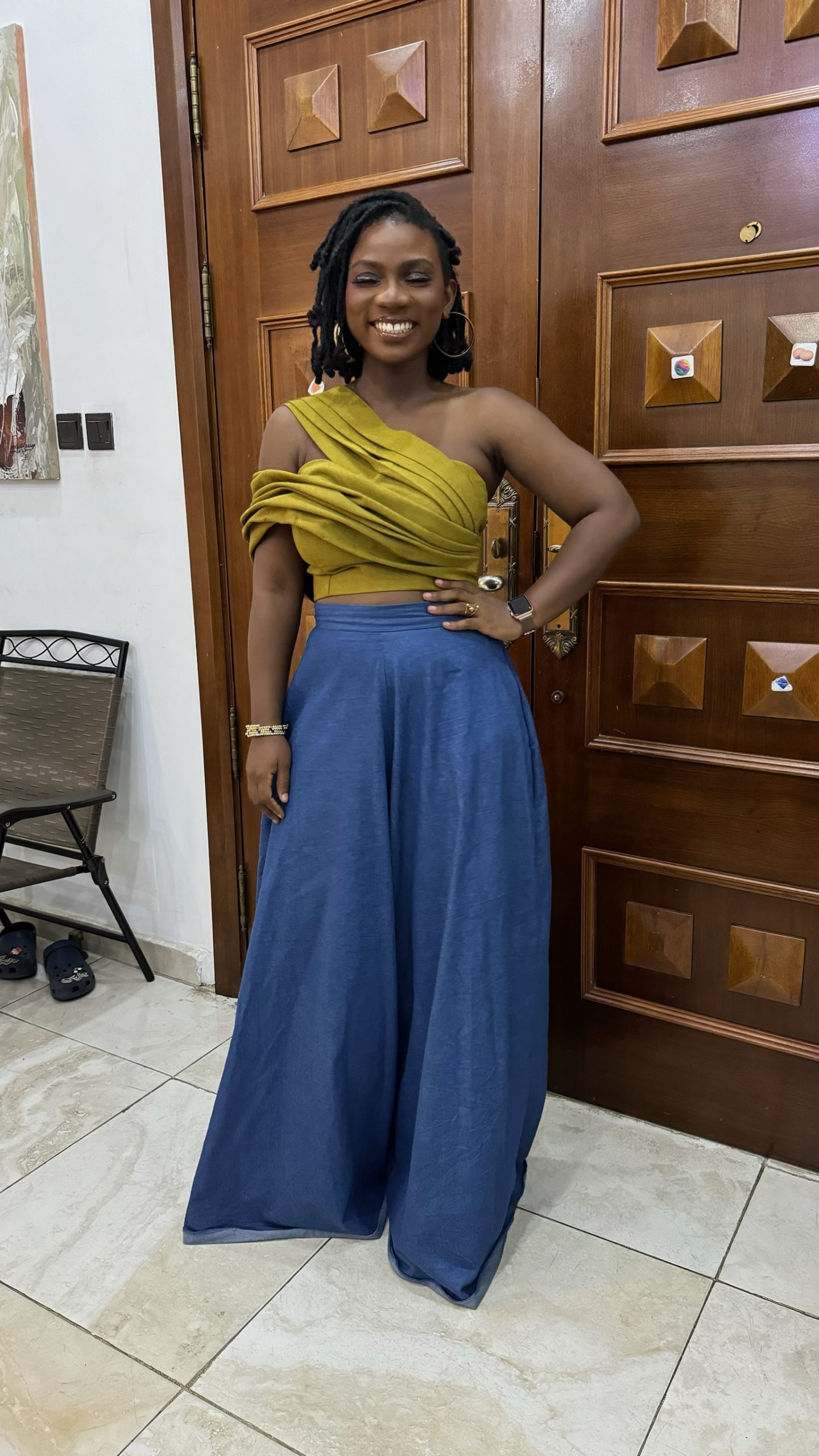 Transform your look with our High-waist palazzo (wide-leg trousers) which is a denim Pant. Denim pants are a versatile addition to your wardrobe. Comfortable side zip fastening for effortless wear characterizes these high-rise pants. This look suits various settings, including elegant workplace attire, breezy evening events, and relaxed vacations. The wide-leg palazzo adds a touch of refinement. The Mojisola Denim Pants are a versatile piece that will turn heads.