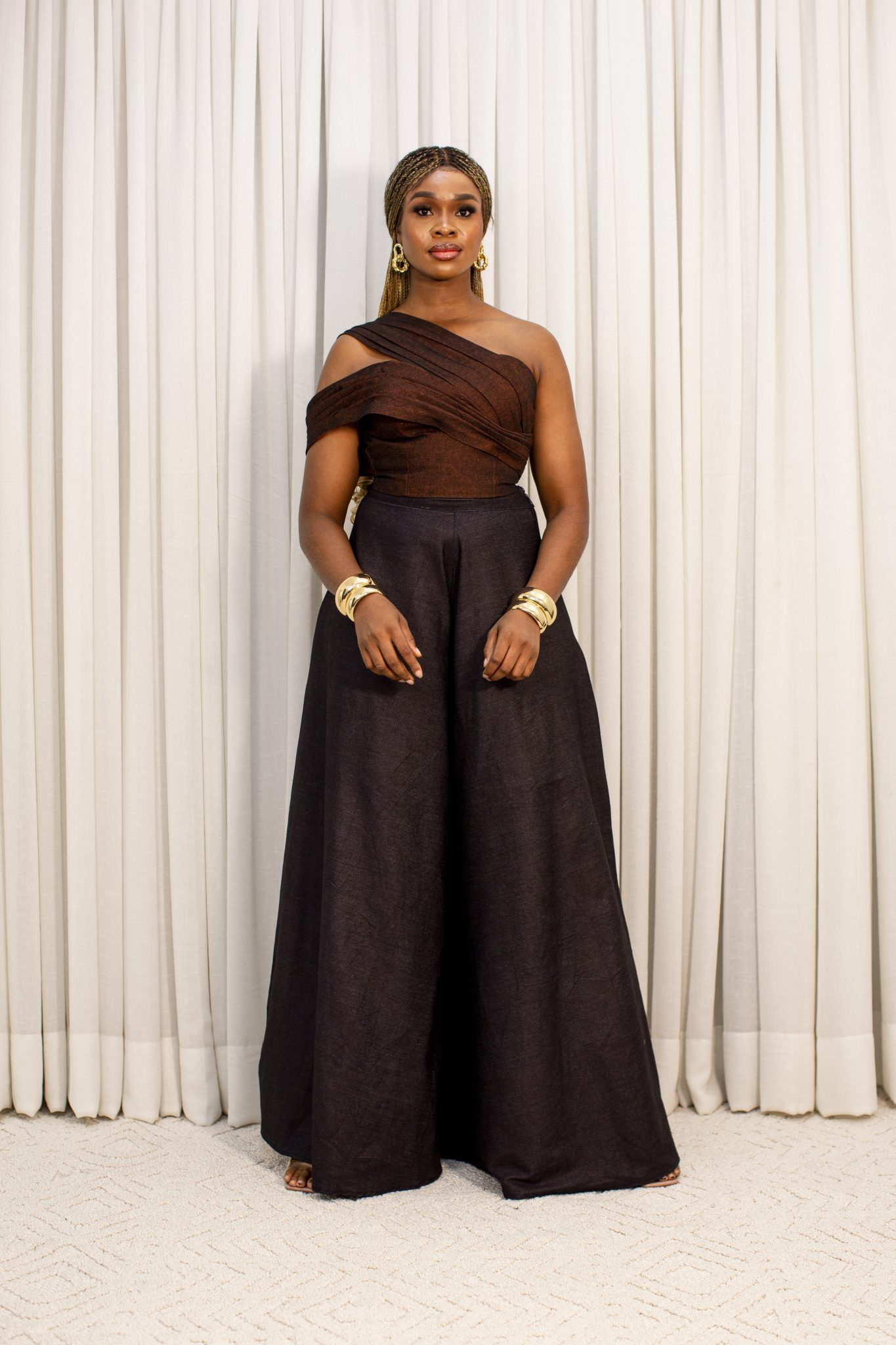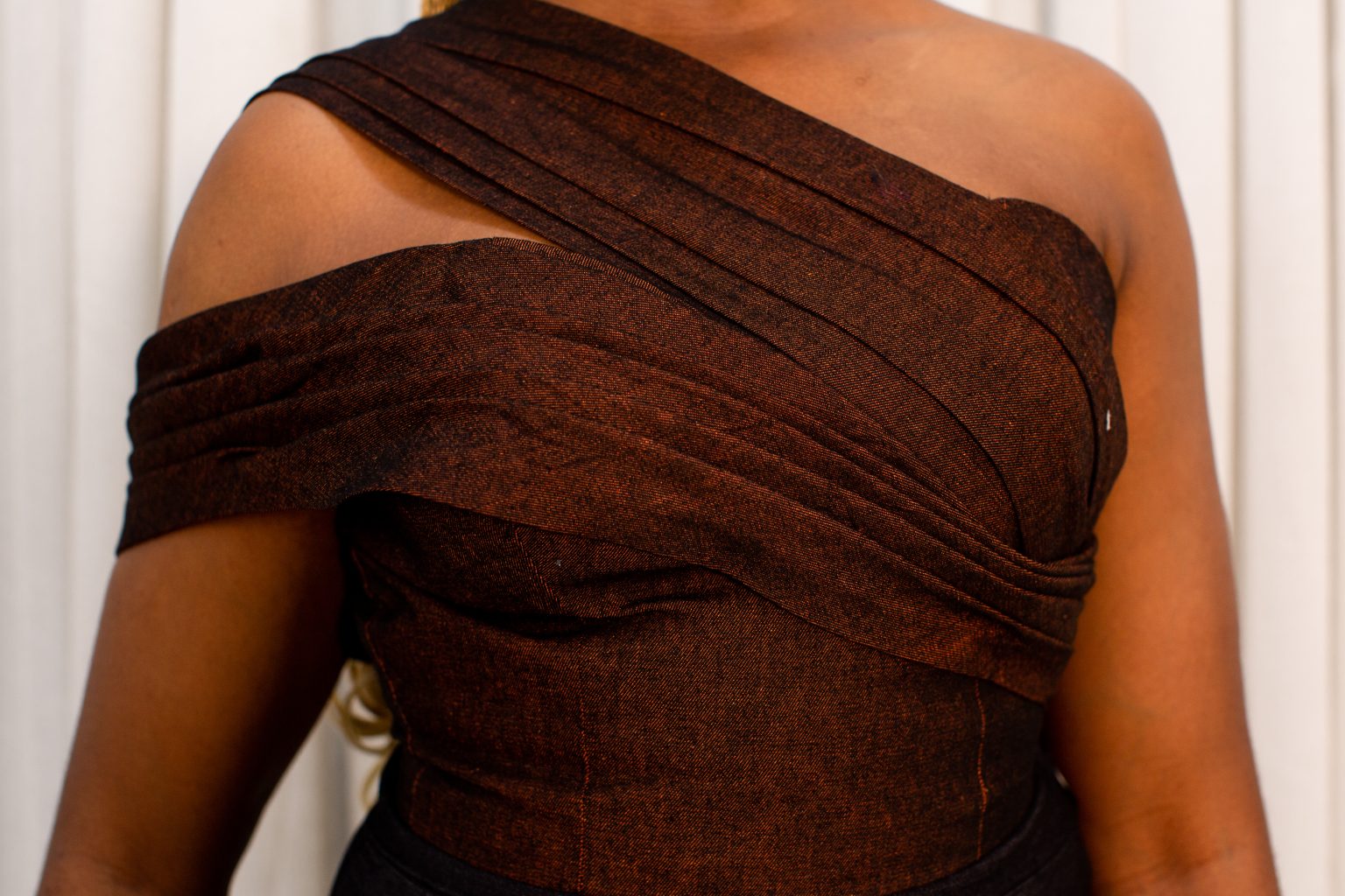 Elevate your style effortlessly with the Omotoke Denim Top. This draped mono strap sleeve crop top is one of a kind and a stylish choice that enhances your appearance with its modern style. The draped sleeves asymmetry gives it a contemporary touch making it suitable for a variety of occasions.
