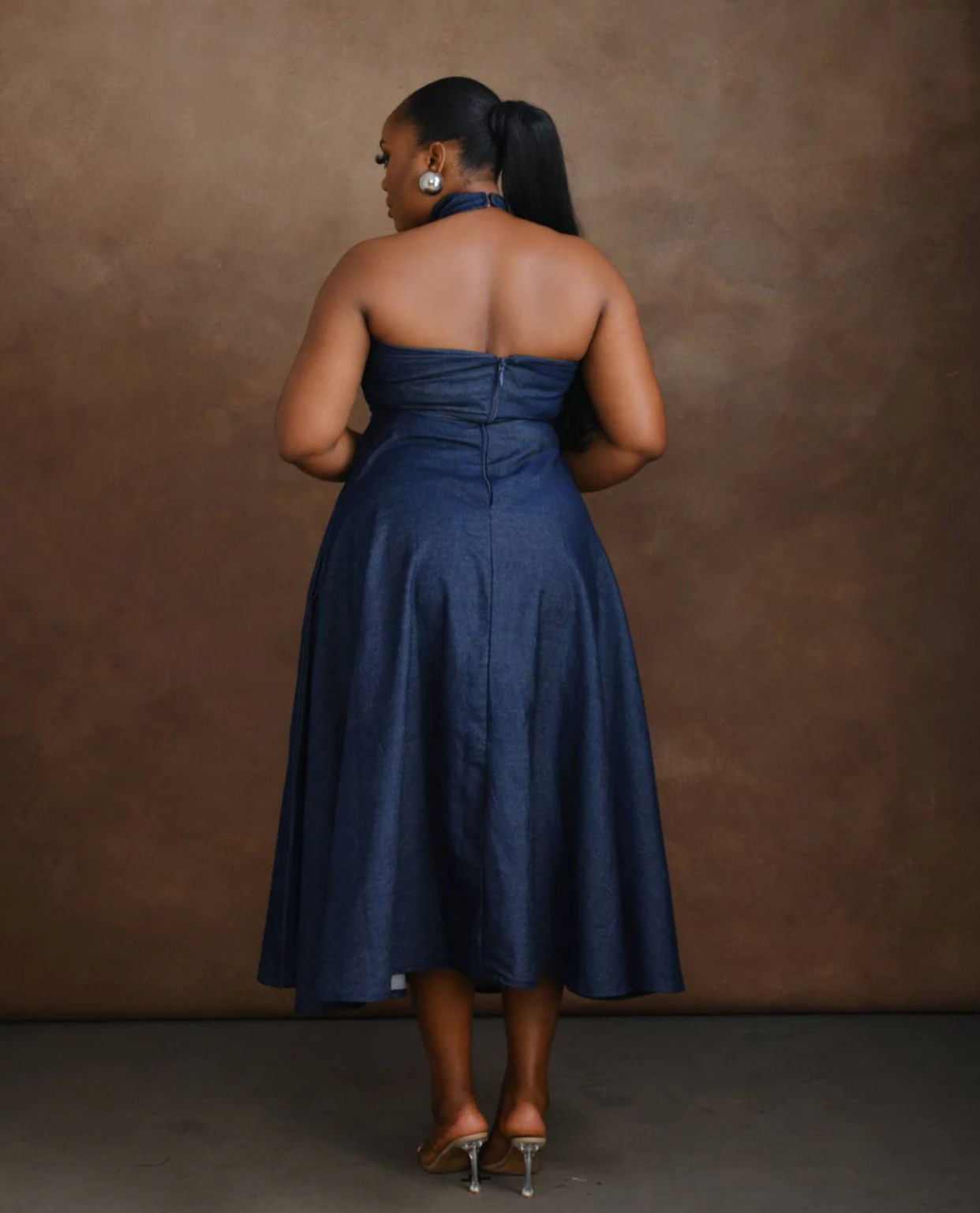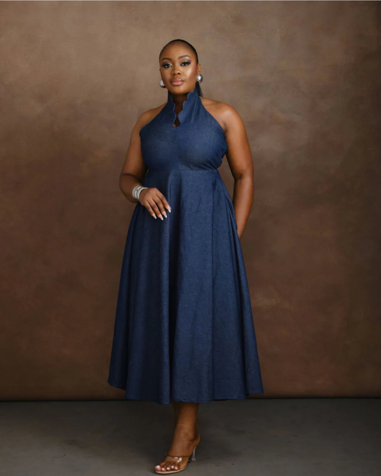 he Yobe Denim Midi Dress is a flattering fit-and-flare silhouette featuring a halter neckline, scallop detailing, and a midi length that exudes effortless elegance.
